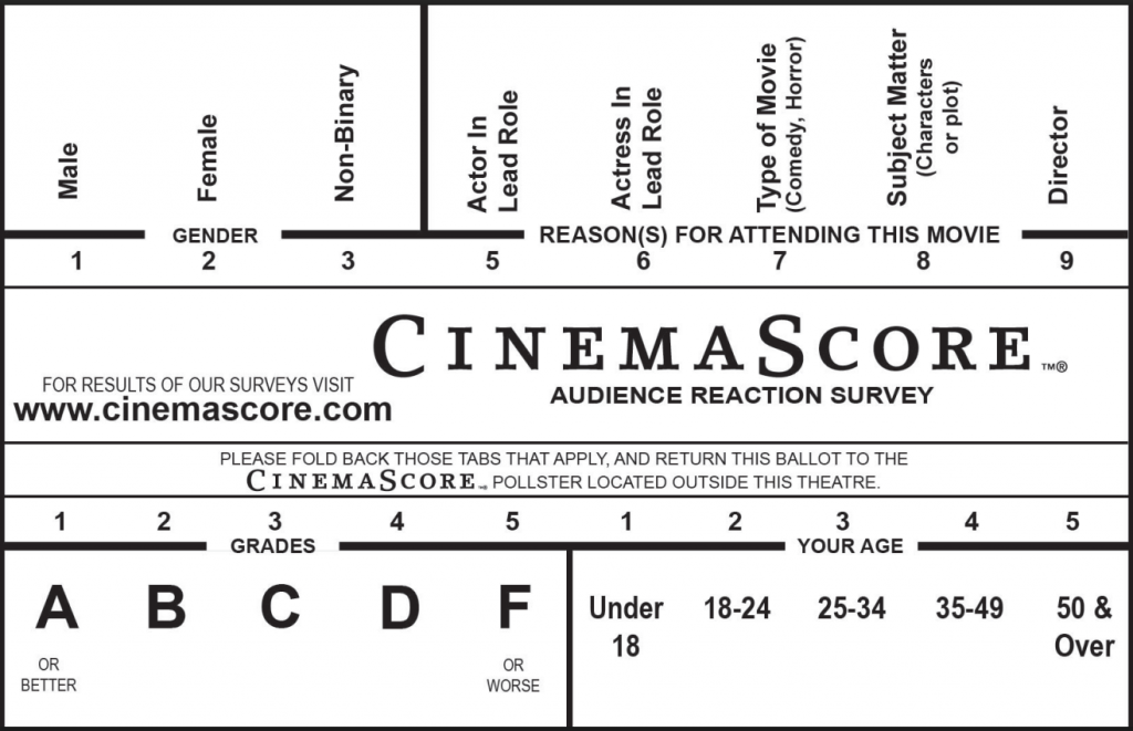 A movie’s overall CinemaScore can range from A+ to F. Each opening weekend, CinemaScore polls moviegoers directly at theatres across North America, including Canada. Pollsters provide audience members a ballot with six questions—including an A to F grade scale, purchase and rental interest and demographic data. To answer these questions, moviegoers bend back tabs on the CinemaScore ballot (instead of having to use a pen or pencil to fill out a questionnaire or survey). After the movie ends, audience members return their ballots to CinemaScore’s pollsters, who tabulate the data and send the results immediately to CinemaScore.